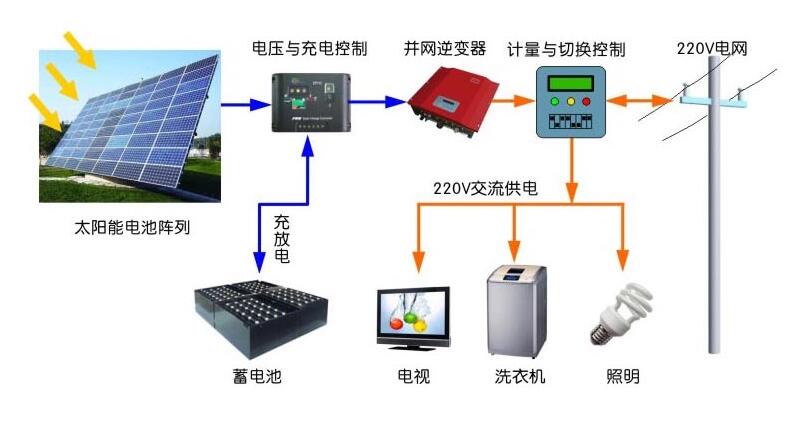 通過充放電控制器對鋰離子電池進行充電,將由光能轉換而來的電能貯存起來。晚上,電池組為逆變器提供輸入電,通過逆變器的作用,將直流電轉換成交流電,輸送到配電柜,由配電柜的切換作用進行供電。蓄電池組的放電情況由控制器進行控制,保證蓄電池的正常使用。光伏電站系統還應有限荷保護和防雷裝置,以保護系統設備的過負載運行及免遭雷擊,維護系統設備的安全使用。太陽能→電能→化學能→電能→光能。